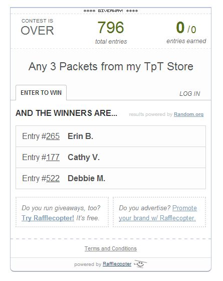 We have 3 winners from my 300 follower giveaway. Erin, Cathy, and Debbie were the winners. I sent y'all an email. Congratulations!